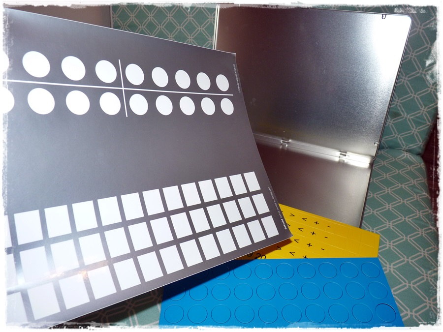 Kasetka wykonana jest z metalu, a dołączone do niej elementy są magnetyczne. Górna podstawa - według pomysłodawcy - służy do przechowywania żetonów 👉 liczb i znaków matematycznych, w sposób uporządkowany, dolna do rozwiązywania.
